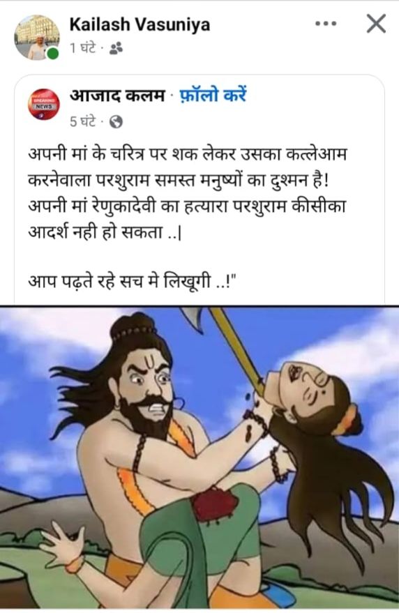 झाबुआ – भगवान परशुराम जन्मोत्सव के शुभ अवसर पर कैलाश वसुनिया नामक युवक द्वारा फेसबुक पर भगवान श्री परशुराम जी के संबंध में आपत्तिजनक, भ्रामक और धार्मिक भावनाओं को आहत करने वाली पोस्ट की गई , इस कृत्य से ब्राह्मण समाज सहित समस्त सनातन धर्मावलंबियों की आस्था को ठेस पहुँची , इस घटना के विरोध में ब्राह्मण समाज, झाबुआ के वरिष्ठ जनों एवं युवाओं का एक बड़ा प्रतिनिधिमंडल आज पुलिस अधीक्षक श्री पद्म विलक्षण शुक्ला से थाना कोतवाली, झाबुआ में मिला और ज्ञापन सौंपा। समाज का कहना है कि यह पोस्ट सुनियोजित तरीके से ब्राह्मणों के अपमान एवं हिंदू समाज के विघटन के उद्देश्य से की गई थी , ब्राह्मण समाज की आपत्ति के बाद युवक ने पोस्ट हटाई और सार्वजनिक रूप से माफी भी मांगी , लेकिन समाज की मांग है कि यह मामला केवल माफी से समाप्त नहीं किया जा सकता। ज्ञापन में कैलाश वसुनिया के विरुद्ध सुसंगत धाराओं में एफआईआर दर्ज कर कठोर कानूनी कार्रवाई की मांग की गई है ।