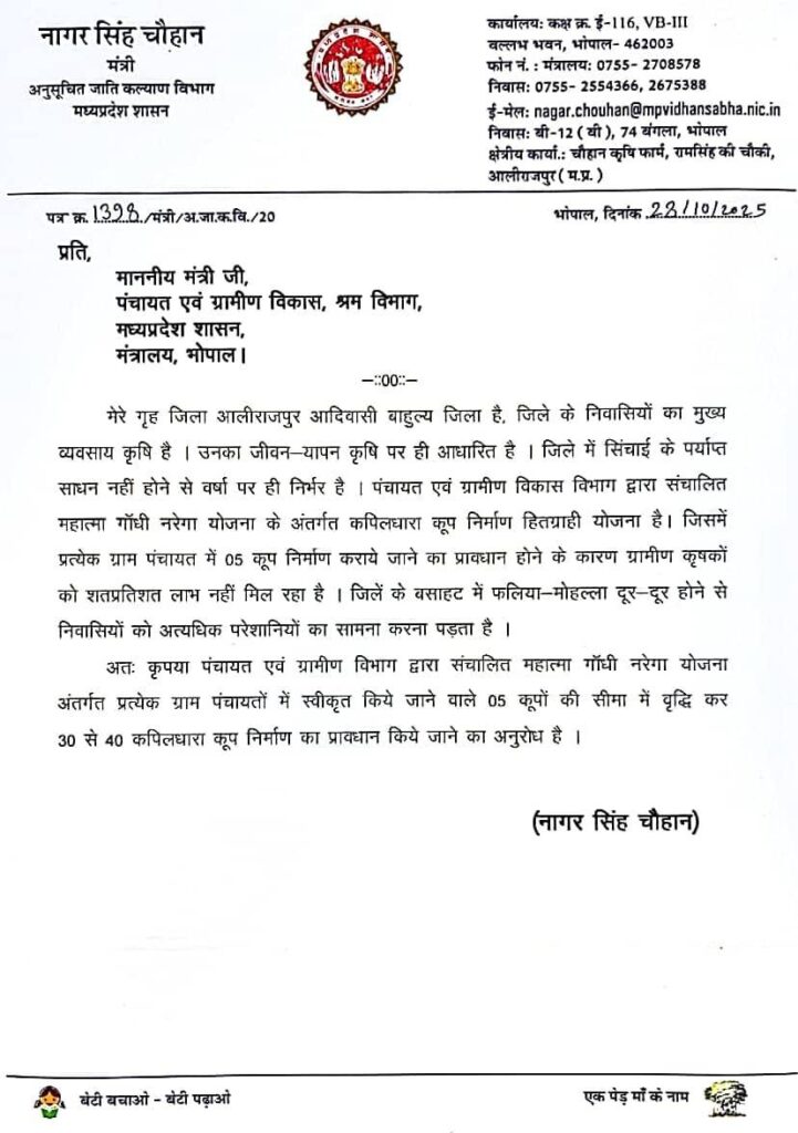 क्या है मुख्य मांग – कैबिनेट मंत्री नागर सिंह चौहान ने पंचायत एवं ग्रामीण विकास मंत्री प्रहलाद सिंह पटेल से मुलाक़ात कर आलीराजपुर जिले के किसानो को उन्नत सिंचाई व्यवस्था की मांग हेतु कपिलधारा कूप खनन की संख्या बढ़ने के संबंध में एक मांग पत्र सौपा , जिसमें मंत्री श्री चौहान ने बताया कि महात्मा गाँधी नरेगा योजना अंतर्गत कपिलधारा कूप निर्माण हितग्राही योजना के अंतर्गत प्रत्येक ग्राम पंचायत में 5 कूप निर्माण कराए जाने का प्रावधान है , साथ ही यह भी नियम बना हुआ है कि आबंटित 5 कूप खनन शत प्रतिशत पूर्ण होने के उपरांत उस ग्राम ने अगला लक्ष्य प्राप्त होगा , मंत्री चौहान ने बताया कि हमारे जिले में कुल 271 ग्राम पंचायते है, जिसमें कुल 552 ग्राम है और सभी की बसाहट फलिया-मोहल्ले के रूप में दूर दूर है , ऐसे में पूरे ग्राम के कृषकों को इसका लाभ मिलना नामुमकिन है , जिसके चलते सिंचाई में पर्याप्त जल नहीं दिया जा पाता है ।