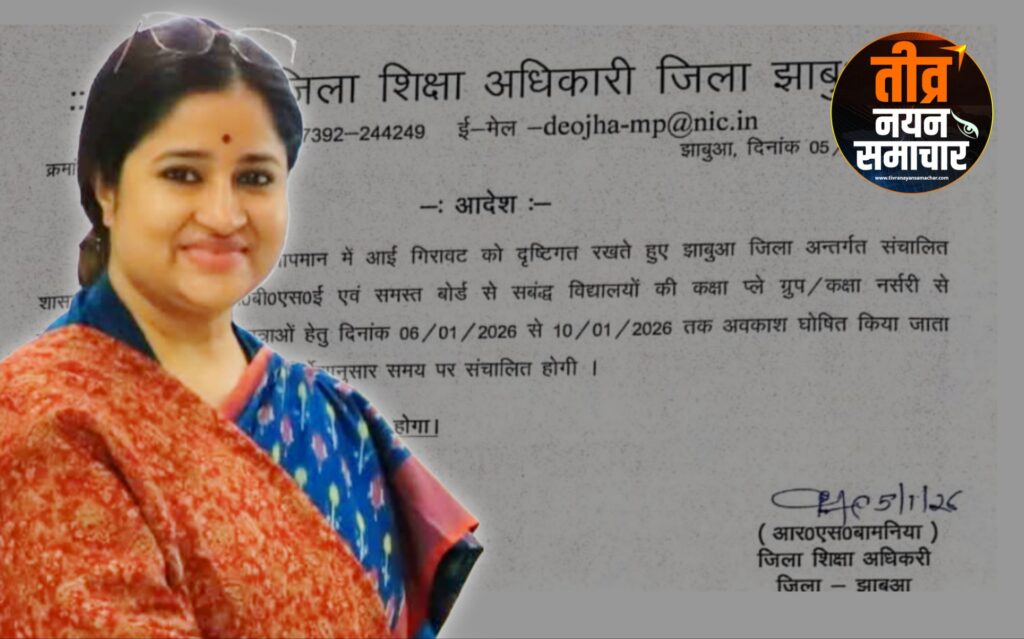 झाबुआ – शीतलहर एवं तापमान में आई गिरावट को दृष्टिगत रखते हुए कलेक्टर नेहा मीना के आदेश अनुसार झाबुआ जिले में संचालित समस्त शासकीय , अशासकीय, सीबीएसई एवं अन्य समस्त बोर्ड से संबद्ध विद्यालयों की प्ले ग्रुप/ प्री-नर्सरी, नर्सरी से कक्षा तीसरी तक के छात्र-छात्राओं के लिए दिनांक 06 जनवरी 2026 से 10 जनवरी 2026 तक अवकाश घोषित किया गया है , जिला शिक्षा अधिकारी श्री आर. एस. बामनिया ने बताया कि उक्त अवधि में संबंधित कक्षाओं के विद्यार्थियों के लिए विद्यालय संचालन स्थगित रहेगा , जबकि अन्य कक्षाएं पूर्व में जारी आदेशों एवं निर्देशों के अनुसार निर्धारित समय पर संचालित होती रहेंगी , यह आदेश तत्काल प्रभावशील होगा ।