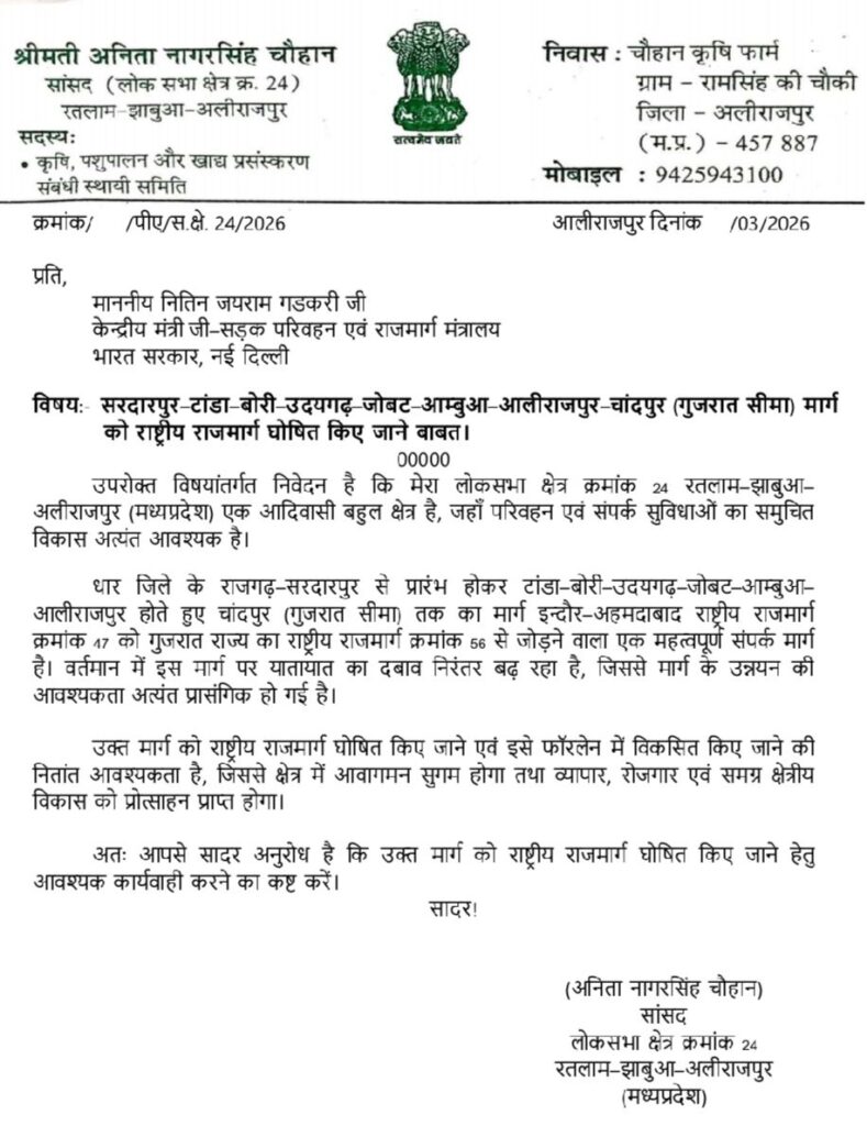 आलीराजपुर – झाबुआ रतलाम संसदीय क्षेत्र की सांसद अनीता नागर सिंह चौहान ने कल संसद भवन मे केंद्रीय सड़क परिवहन एवं राजमार्ग मंत्री नितिन गटकरी से मुलाक़ात की , सांसद अनीता चौहान द्वारा केंद्रीय मंत्री को पत्र सोपकर धार जिले के राजगढ़ , सरदारपुर से प्रारम्भ होकर टांडा – बोरी – उदयगढ़ – जोबट – आम्बुआ – आलीराजपुर – चांदपुर तक का मार्ग जो (गुजरात सीमा) से जुड़ता है , उसे राष्ट्रीय राजमार्ग घोषित किए जाने का विषय प्रमुखता से रखा , उन्होंने केंद्रीय मंत्री गटगरी से कहा की यह मार्ग आदिवासी अंचल के विकास , बेहतर कनेक्टिविटी एवं व्यापारिक गतिविधियों को बढ़ावा देने की दृष्टि से अत्यंत महत्वपूर्ण है , इसपर दिन प्रतिदिन यातायात दबाव बड रहा है तथा इस मार्ग को राष्ट्रीय राजमार्ग घोषित कर फॉर लेन बनाने की अत्यंत आवश्यकता है ।